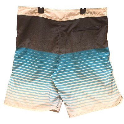 Keywords: Hurley board shorts, men's swim trunks, ombre board shorts, striped swim trunks, drawstring board shorts, size 36 board shorts, beach wear, swimwear, surf shorts, pool shorts, summer shorts, Hurley swimwear, men's beach fashion