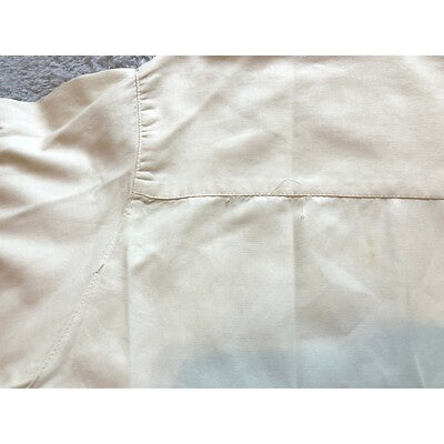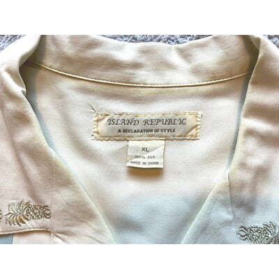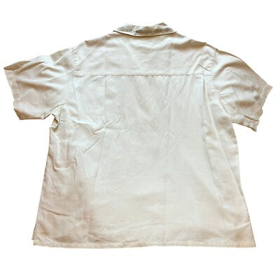 Keywords: Richard Honaker, camp shirt, mens shirt, button up shirt, striped shirt, embroidered collar, short sleeve shirt, casual shirt, beach shirt, vacation shirt, summer shirt, size L, cream shirt, blue shirt, beige shirt