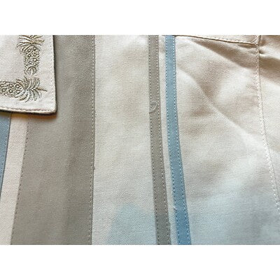 Island vibes abound in this Richard Honaker camp shirt, a perfect blend of relaxed style and subtle sophistication. The cream-colored fabric is punctuated by vertical stripes in soft blue and beige, creating a visually appealing and versatile design. Delicate embroidery adorns the collar, adding a touch of refined detail. The button-up style allows for easy wear, while the short sleeves keep you cool and comfortable. Imagine yourself wearing this shirt on a casual weekend getaway, a relaxed evening at a beachside restaurant, or even a summer barbecue with friends.