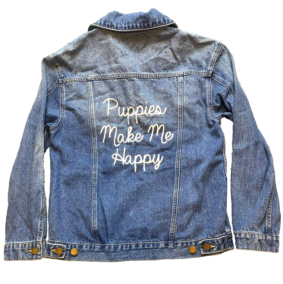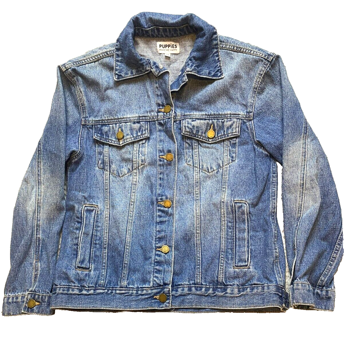JBD Just Black Denim Jacket Women Medium Blue Jean Trucker Puppies Make Me Happy