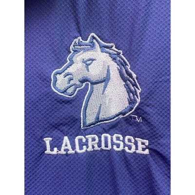 A sporty, cool look comes alive with this Under Armour lacrosse polo shirt. The rich royal blue color is immediately striking, while the horse head logo and 'Lacrosse' text subtly showcase athletic spirit. Designed with Under Armour's signature Iso-Chill technology, this polo promises breathable comfort, keeping you cool and dry whether you're on the field or cheering from the sidelines. White striped detailing on the shoulders adds a touch of modern flair, and the classic polo collar lends a touch of timeless style. This versatile polo is perfect for game days, casual outings, or any occasion where comfort and performance matter.