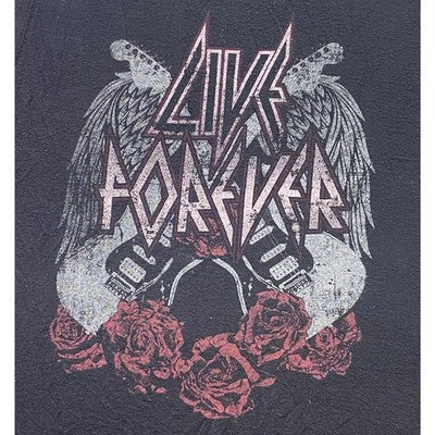 Unleash your inner rocker with this edgy Rosie Harlow tank top! This black rocker-chic tank features a bold graphic print with guitars, roses, wings and the words "Live Forever", creating a powerful and rebellious vibe. The classic tank top design is perfect for layering or wearing on its own. Its soft and breathable fabric ensures all-day comfort, while the flattering fit accentuates your figure. Pair it with ripped jeans and combat boots for a concert, wear it with a leather jacket for a night out, or dress it down with shorts for a casual weekend look.