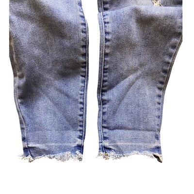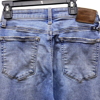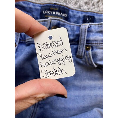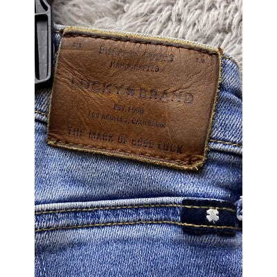 Keywords: Lucky Brand, skinny jeans, distressed jeans, frayed hem, light wash denim, women's jeans, size 4/27, casual jeans, denim pants, stylish jeans, modern jeans, designer jeans, ripped jeans, ankle jeans