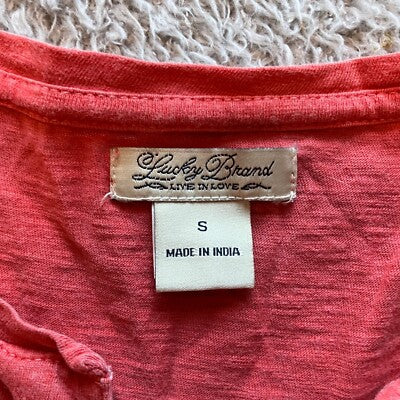Keywords: Lucky Brand, tunic top, embroidered top, coral top, v-neck top, 3/4 sleeve top, bohemian style, casual top, women's top, size small, floral embroidery, summer top, spring top