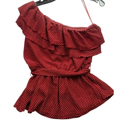 Keywords: Maeve, Anthropologie, Blouse, Top, Red, Polka Dot, One Shoulder, Ruffle, Tie Waist, Medium, Womens, Party, Date Night, Bohemian