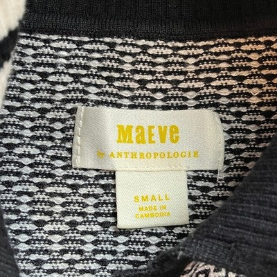 Keywords: Maeve, Anthropologie, Cardigan, Sweater, Cropped, Geometric, Knit, Black and White, Small, Mock Neck, Ribbed, Button Down, Viscose Blend