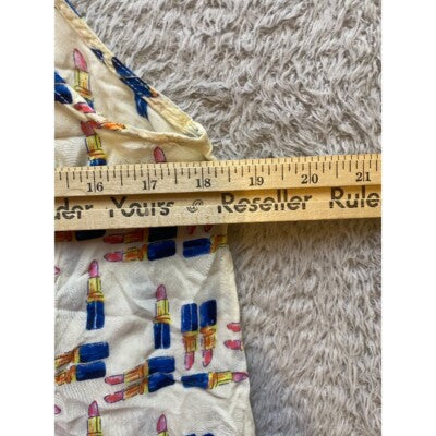A playful statement piece, this Maeve blouse bursts with a vibrant lipstick print, offering a whimsical twist on a classic silhouette. The sleeveless design and button-down front create a versatile and breezy feel, perfect for warm weather. The unique print features rows of colorful lipsticks in shades of blue, pink, and gold, adding a pop of personality to any outfit. The collared neckline adds a touch of sophistication, while the slightly asymmetrical hemline provides a modern edge. This top is ideal for adding a fun and flirty touch to your everyday style, whether you're heading to brunch with friends or enjoying a casual day out.