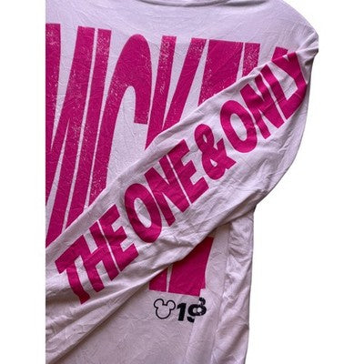 Unleash your inner child with this playful Disney Mickey Mouse long-sleeve t-shirt. The crisp white backdrop allows the vibrant pink "MICKEY THE ONE & ONLY" graphic on the back and sleeve to truly pop, while the front features a whimsical, distorted Mickey Mouse design. This shirt is a celebration of the iconic character's legacy, perfect for adding a touch of nostalgia and fun to your everyday wardrobe. Whether you're headed to a casual brunch, a theme park adventure, or simply lounging at home, this tee is sure to bring a smile to your face and spark conversations.