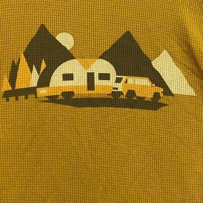 Embrace effortless style with this Old Navy long-sleeve tee, a garment that speaks to both comfort and outdoor adventure. The rich, mustard-yellow hue serves as a canvas for a captivating graphic print featuring a vintage camper nestled among majestic mountains, evoking feelings of wanderlust and cozy nights under the stars. Crafted in a soft waffle knit, it offers a tactile experience that's as pleasing as it is durable, promising warmth and breathability for all-day wear. The classic crew neck and relaxed fit provide a timeless silhouette, making it a versatile staple for any wardrobe. This charming tee is perfect for casual weekend outings, layering on brisk morning hikes, or simply unwinding at home with a cup of coffee.