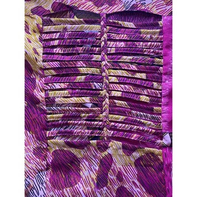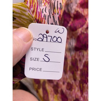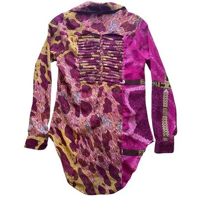 Keywords: multicolor blouse, mixed print shirt, long sleeve blouse, button down shirt, purple and yellow top, statement blouse, unique design top, collared blouse, fashionable blouse, bohemian top, festival fashion, artsy clothing, color block blouse