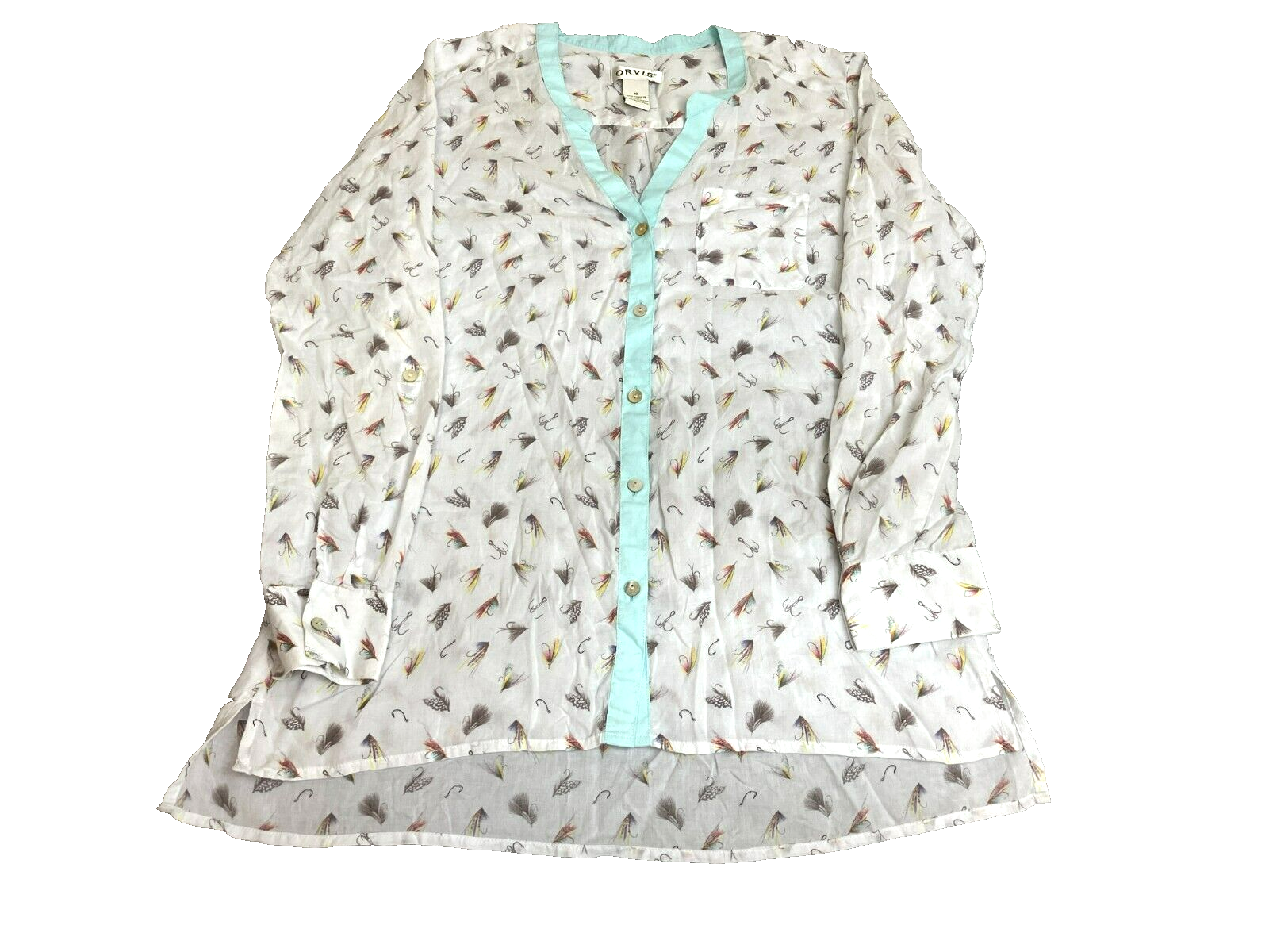 Orvis Shirt Womens 10 White AOP Fishing Lure Button Up Tunic Tencel Lightweight