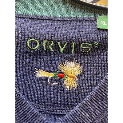 Keywords: Orvis sweater, V-neck sweater, fly fishing sweater, embroidered sweater, mens knit top, pullover sweater, casual sweater, outdoor sweater, navy sweater, XL sweater, menswear, fishing apparel, preppy style