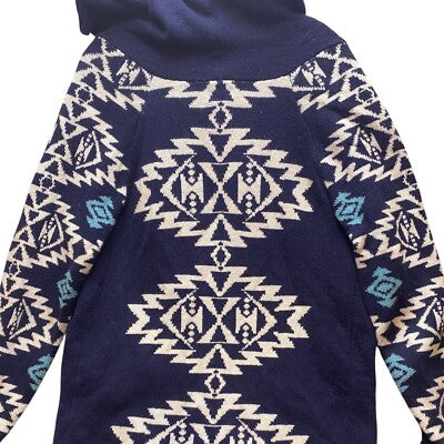 Keywords: Pendleton, hooded cardigan, Aztec print, sweater jacket, knit cardigan, bohemian style, open front cardigan, womens cardigan, medium size, blue cardigan, casual cardigan, fall fashion, winter fashion, outerwear, cozy sweater