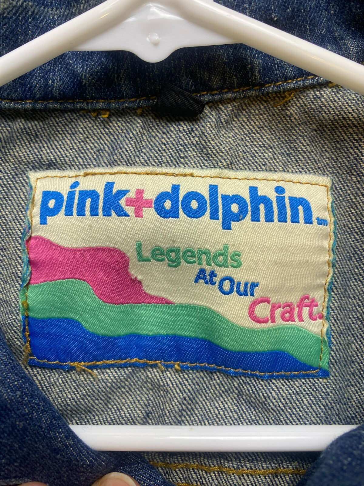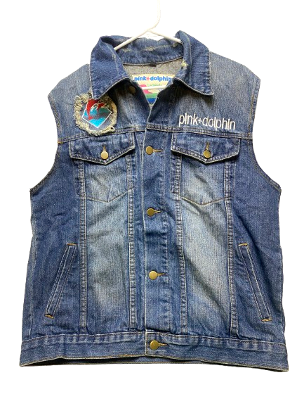 Pink Dolphin Vest Adult Large Blue Denim Button Up Patch Embroidered Kidcore Men