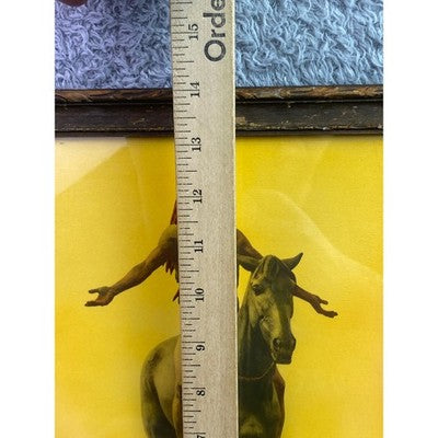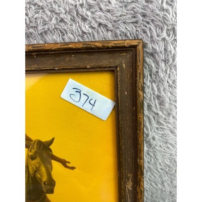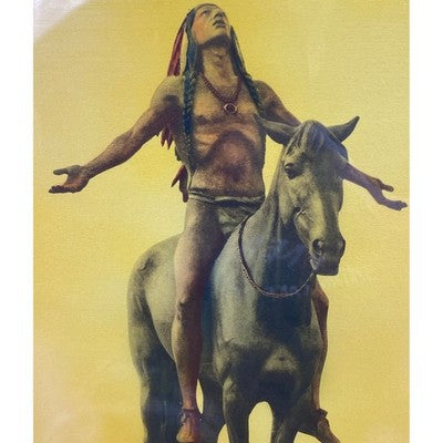 Captivating artwork transports you to a moment of profound connection with nature and spirit. This striking print showcases a Native American warrior, arms outstretched, riding a powerful horse against a vibrant, sun-drenched sky. The artist's masterful rendering of light and shadow on both the warrior and the steed creates a sense of dynamism and raw emotion, while the subtle landscape in the background grounds the scene. Framed in a distressed wooden border, this piece adds a touch of historical charm and rugged beauty to any space. Imagine this evocative artwork gracing your living room, study, or as a captivating focal point in a rustic-themed setting.