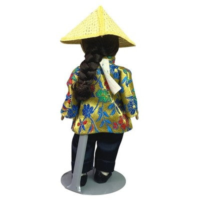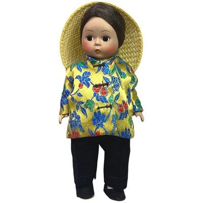 Enchanting collectors with her serene expression, this Madame Alexander "China" doll invites you into a world of cultural artistry. Her vibrant yellow brocade jacket, adorned with intricately woven blue, red, and green floral patterns, whispers tales of exotic lands. The matching black trousers and traditional conical straw hat complete her striking ensemble, evoking a sense of timeless elegance. Presented in her original, beautifully decorated Madame Alexander box, this doll is a treasure waiting to be displayed. Perfect for a doll enthusiast's collection, a unique decorative accent for a bookshelf, or a thoughtful gift for someone who appreciates global artistry.